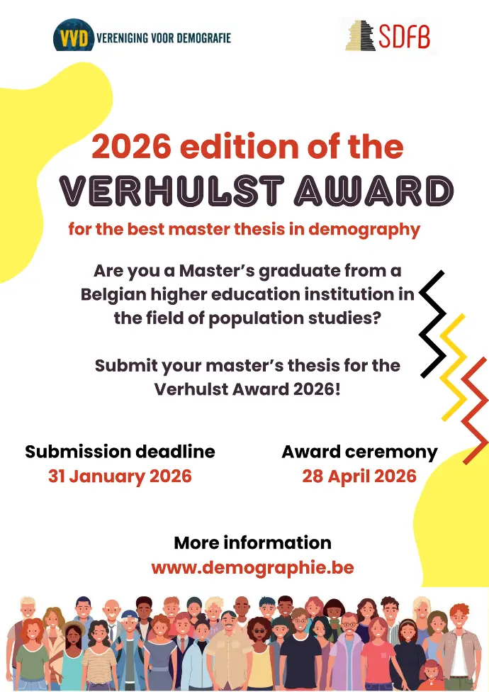 Le 28 avril 2026, la Société Démographique Francophone de Belgique et la Vereniging Voor Demografie décerneront le Prix Verhulst 2026 à un mémoire de master de haute qualité dans le domaine des sciences de la population.